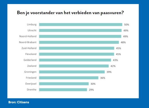 Vorig jaar vroeg een onderzoeksbureau Citisens aan ruim 8.000 Nederlanders hoe zij aankijken tegen het verbieden van paasvuren. Gemiddeld 44% blijkt voor een verbod te zijn. De mening verschilt per provincie (zie afbeelding). Tegenstanders vinden de paasvuren een belangrijk moment om met het dorp samen te komen (30%) en vinden de traditie belangrijk (25%).